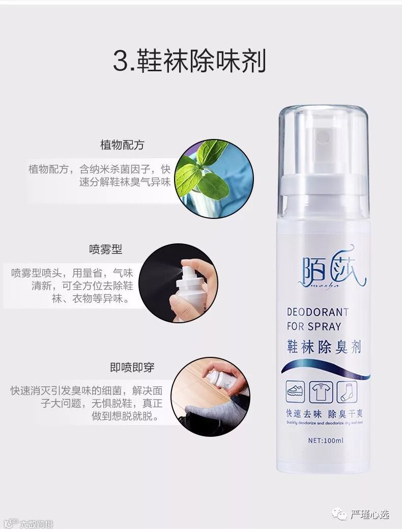 鞋袜除臭剂:运动鞋 皮鞋 帆布鞋 臭袜子 鞋柜 衣帽间 脚臭等能够快速清除异 味,拥有抗菌功效!