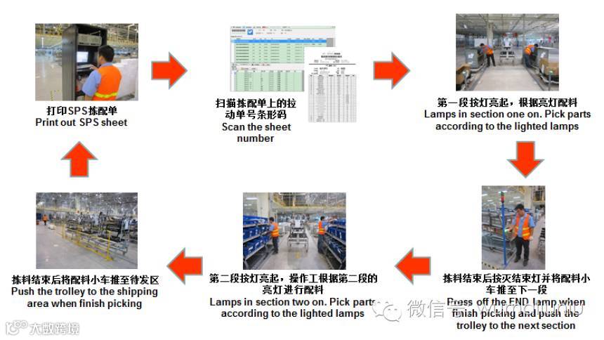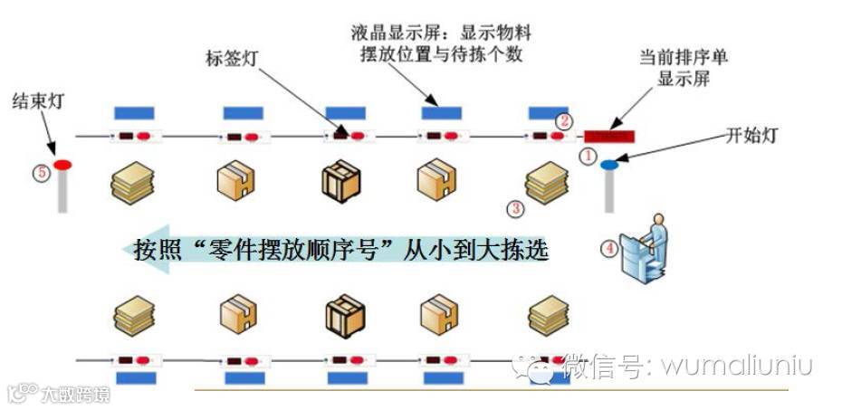 所以,一些较知名的主机厂开始导入按灯拣配系统PTL(Pict toLight)的系统配合接口到现有MES 系统。当排序单打印出来,排序的数据也同时导入到PTL系统中去。 此时扫描排序但是的条形码,按灯系统解读到零件号,并且这些零件号位置上对应的灯会亮起来。拣配人员根据亮灯指示拣配零件,每拣完一个零件,按灭对应这个零件位置上的灯。简单来说,就像下面的简单流程图:
