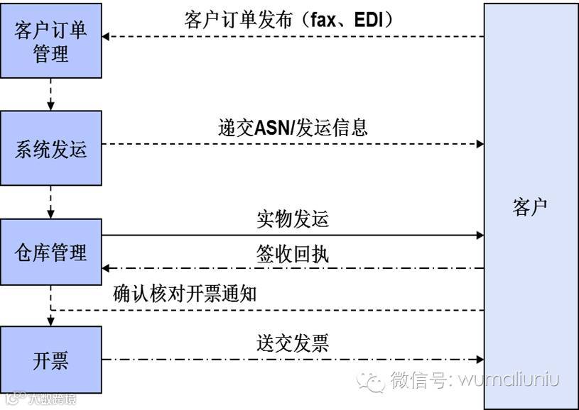 流程左边的流程的开始是客户订单,供应商从客户接收客户订单。客户订单的类型是决定成品生产完之后,在供应链的哪一个阶段开票,结账的重要因素。