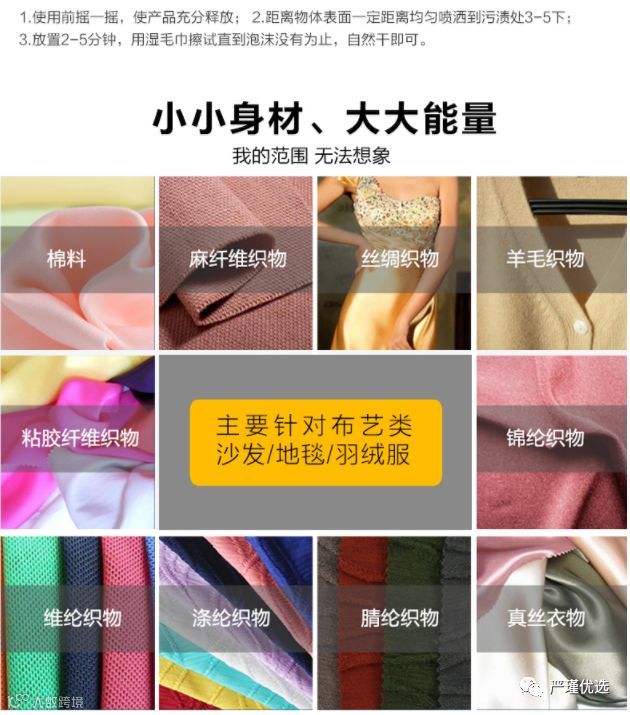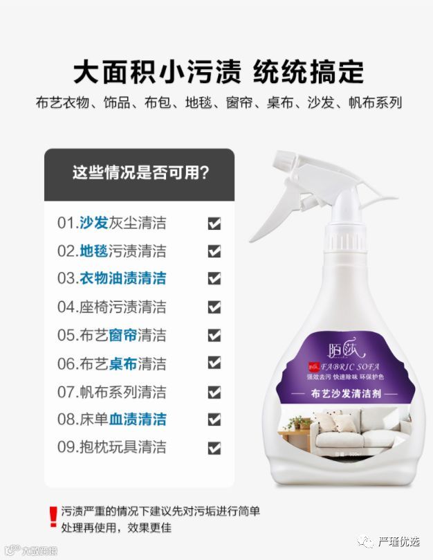 布艺沙发清洁剂:沙发 窗帘 羽绒服 棉衣 被子 裤子等遇到红酒-菜品油渍-咖啡-酱汁-血渍-果汁等都能够清除干净 免水洗!