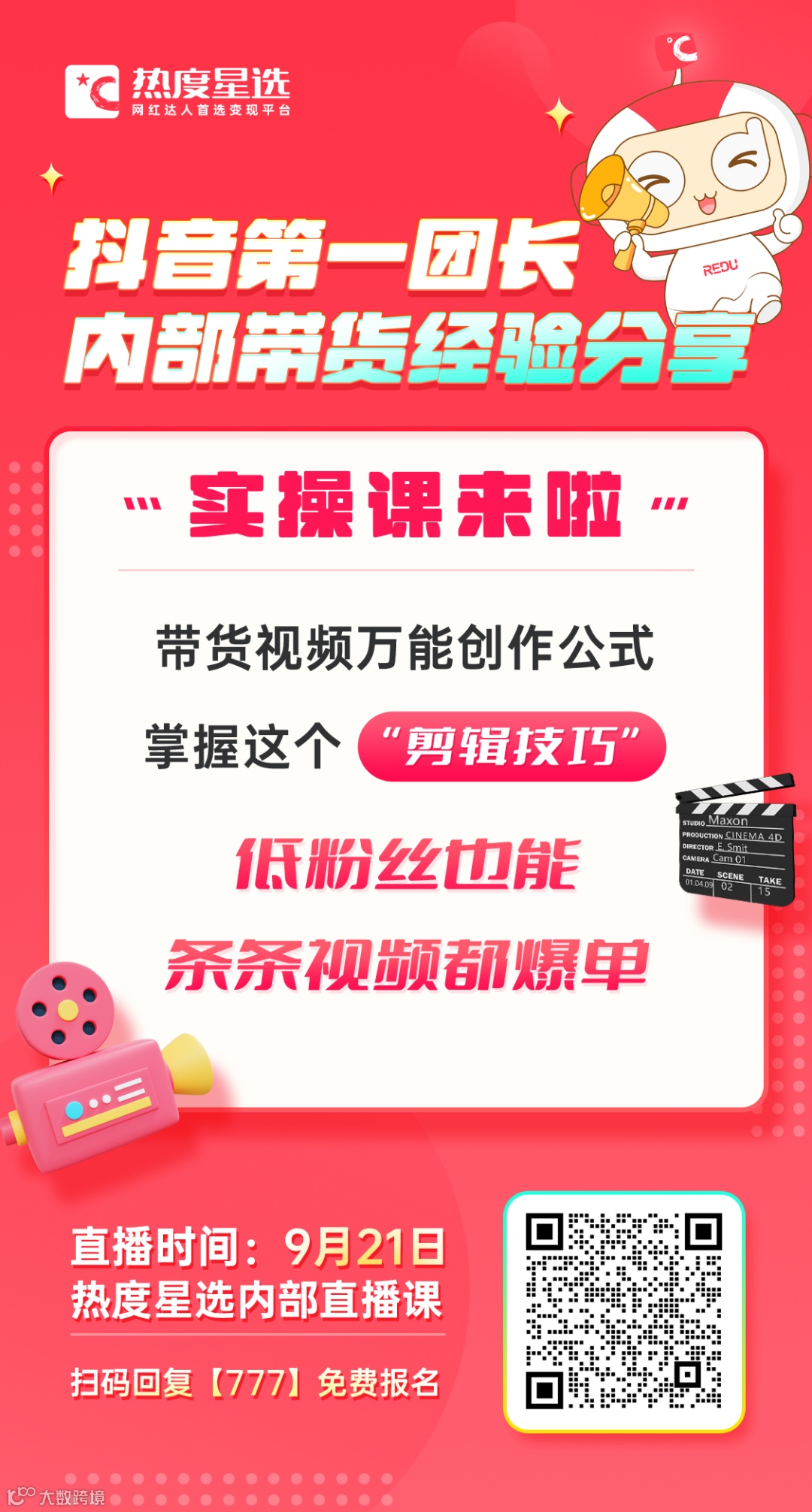 本次将通过内部直播课的方式,把短视频带货剪辑的一些经验免费分享给大家。除了直播课,还有超多免费剪辑素材送给大家。