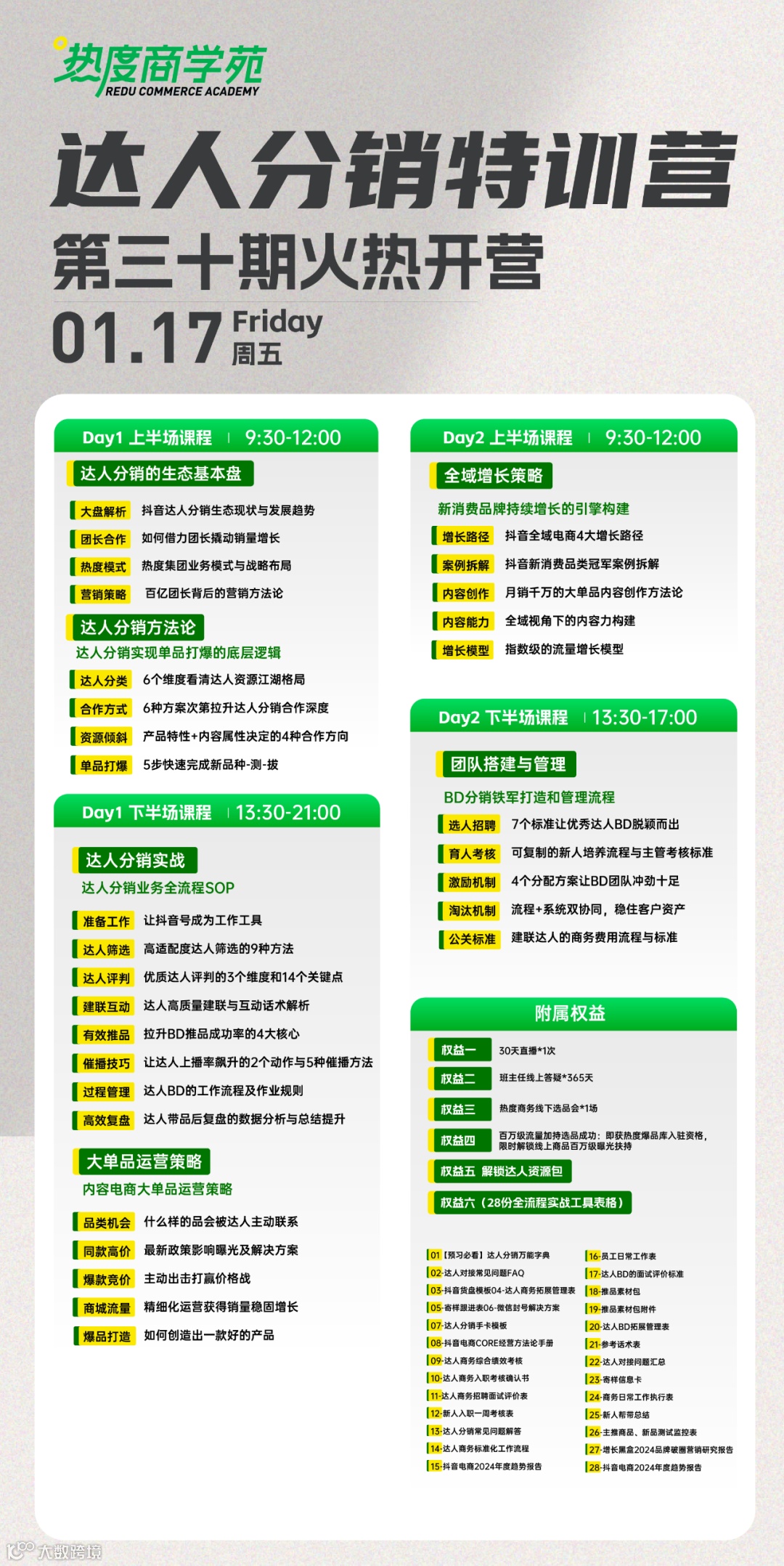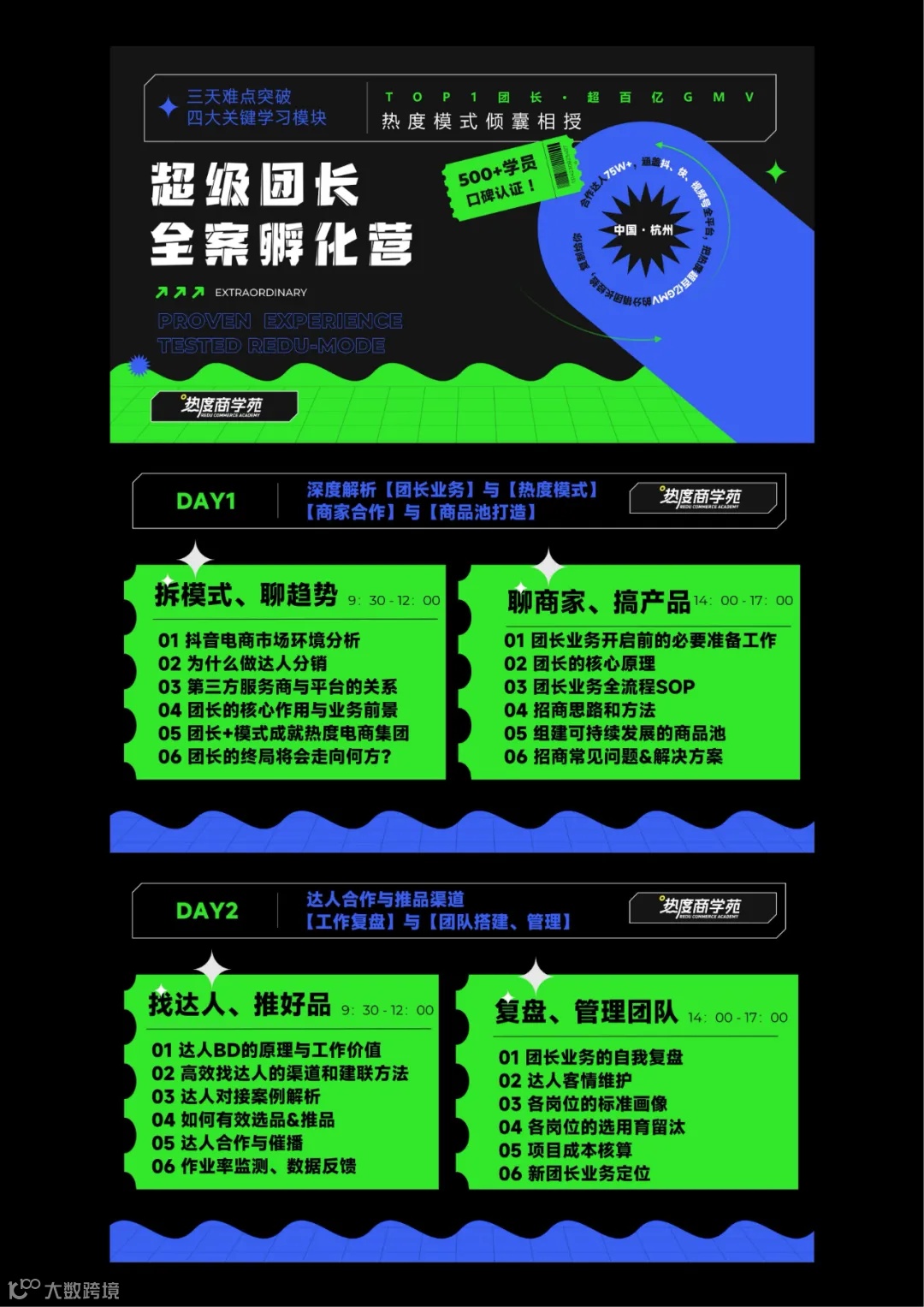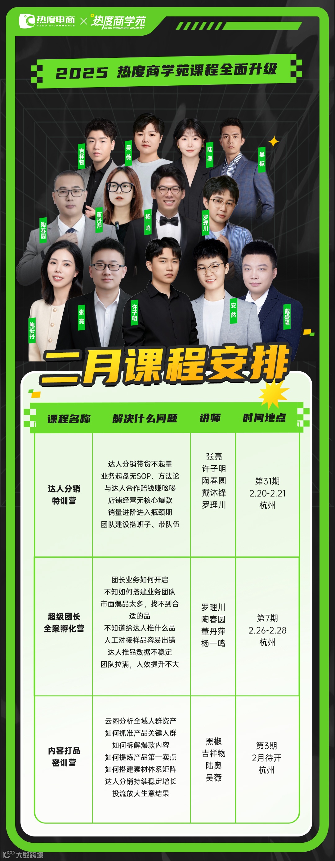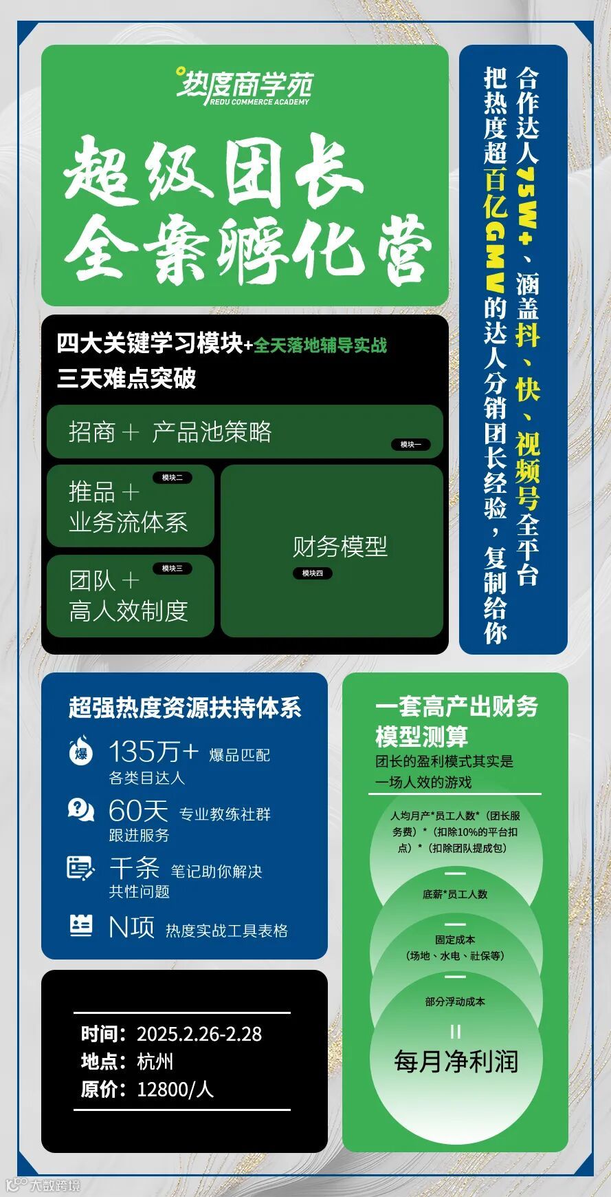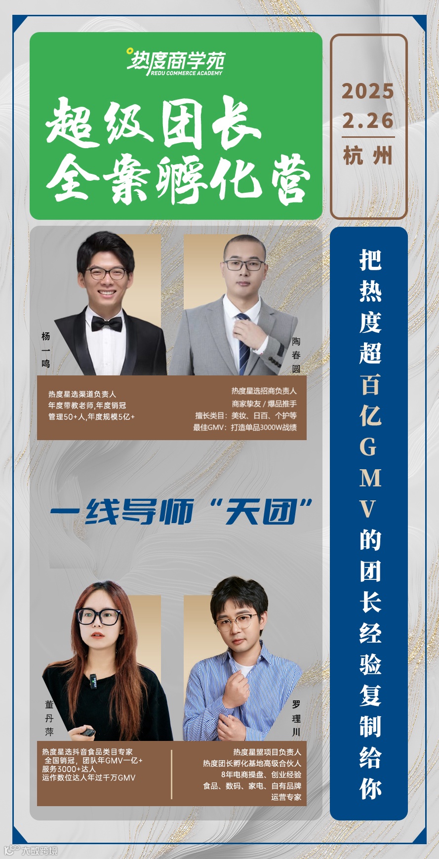 作为热度电商旗下专注于内容电商的实战型商学院,热度商学苑汇聚了众多实战派导师和优质资源,覆盖30多个细分行业,拥有3000多名品牌学员,服务学员的GMV超过100亿。我们提供的不仅是培训课程,而是一整套专业化、体系化、可落地的解决方案。