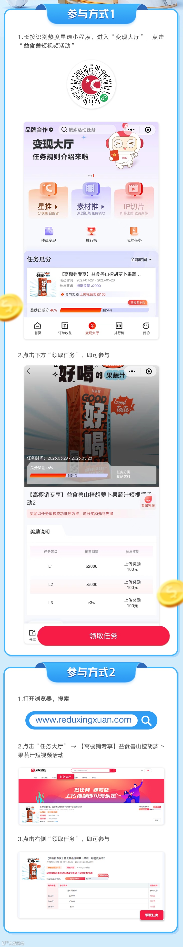 🎁 奖励方式:品牌(益食兽)任务参与,上传符合活动要求的视频(需挂商品链接),即可获得100元/250元现金奖励。