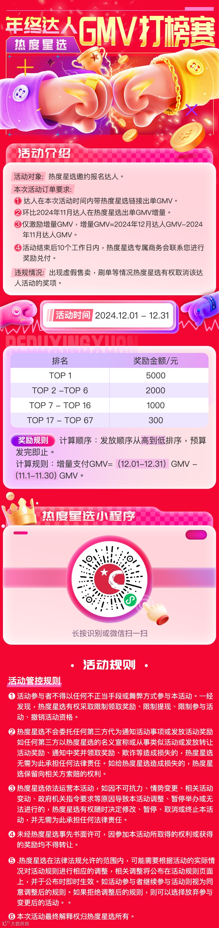 ● 奖励规则:①、活动期间,已成功报名的达人通过带热度星选团长链接出单GMV;②、环比2024年11月达人在热度星选出单GMV增量;③、仅激励增量GMV,增量GMV=2024年12月达人GMV-2024年11月达人GMV。(活动结束后10个工作日内,热度星选专属商务会联系您进行奖励兑付。)