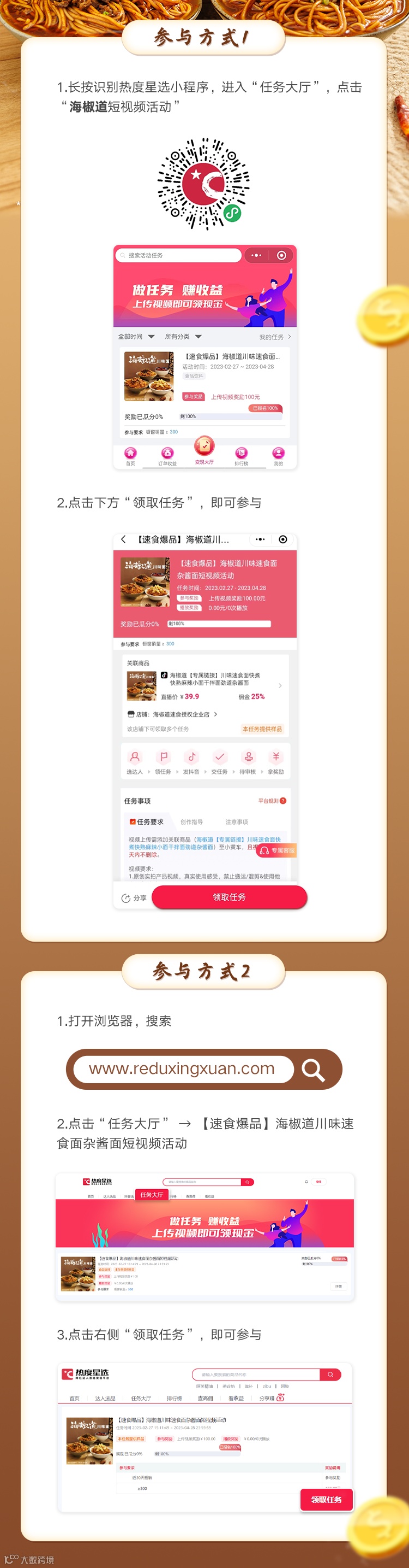 品牌(海椒道)任务参与,上传符合活动要求的视频(需挂商品链接),即可获得