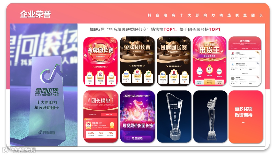 自项目上线以来,累计合作商家50000+家,精选SKU80000+个,合作带货主播100000+人,多次蝉联抖音精选联盟服务商TOP1,抖音短视频带货机构TOP1,快手快分销团长服务榜TOP1。