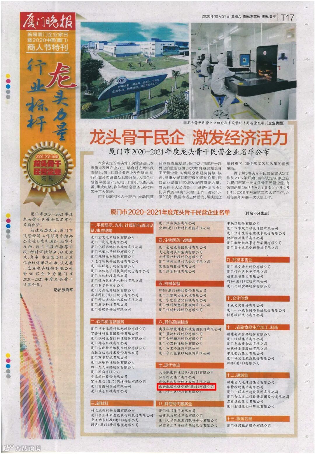 经过层层选拔,云仓配供应链管理(厦门)有限公司被授予“厦门市2020-2021年度龙头骨干民营企业”。