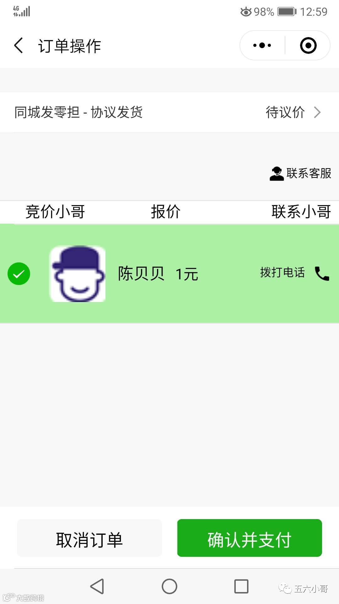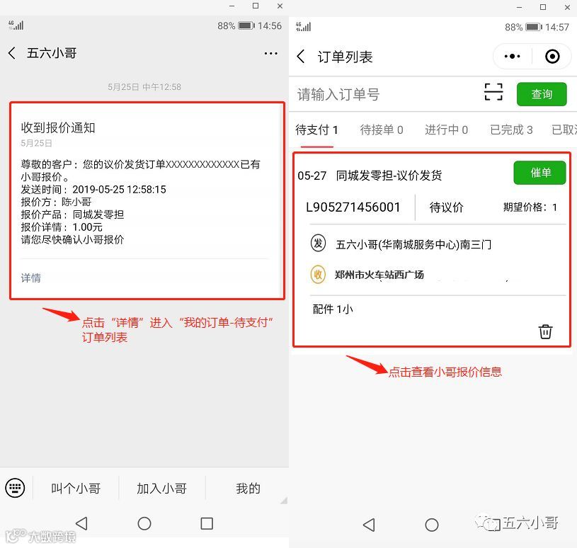 议价发货单等待小哥报价。有小哥报价后,五六小哥微信公众号会给出信息提示,点击提示信息可进入“我的订单-待支付”订单列表