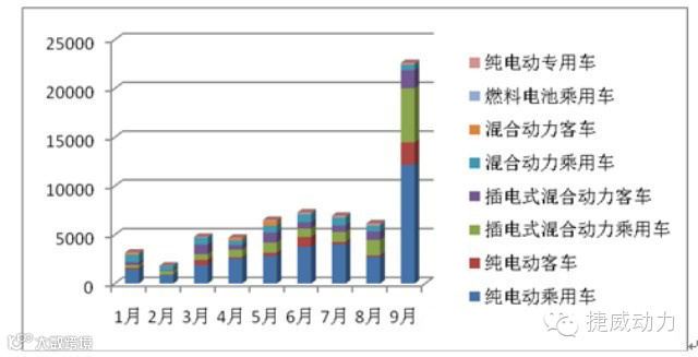 9月节能与新能源汽车产量(含公告内铅酸电池车辆及合资企业生产非自主品牌混合动力乘用车)共22633辆,按能源类型分:新能源汽车(EV、PHEV)22047辆,混合动力汽车(HEV)586辆;按车型分:乘用车18302辆,占80.9%(其中新能源乘用车17743辆,混合动力乘用车559辆);客车4168辆,占(其中新能源客车4141辆,混合动力客车27辆),新能源专用车163辆(占0.7%)。纵观2014年前9个月,新能源乘用车占比稳步攀升,已成为我国节能与新能源汽车市场的主力。