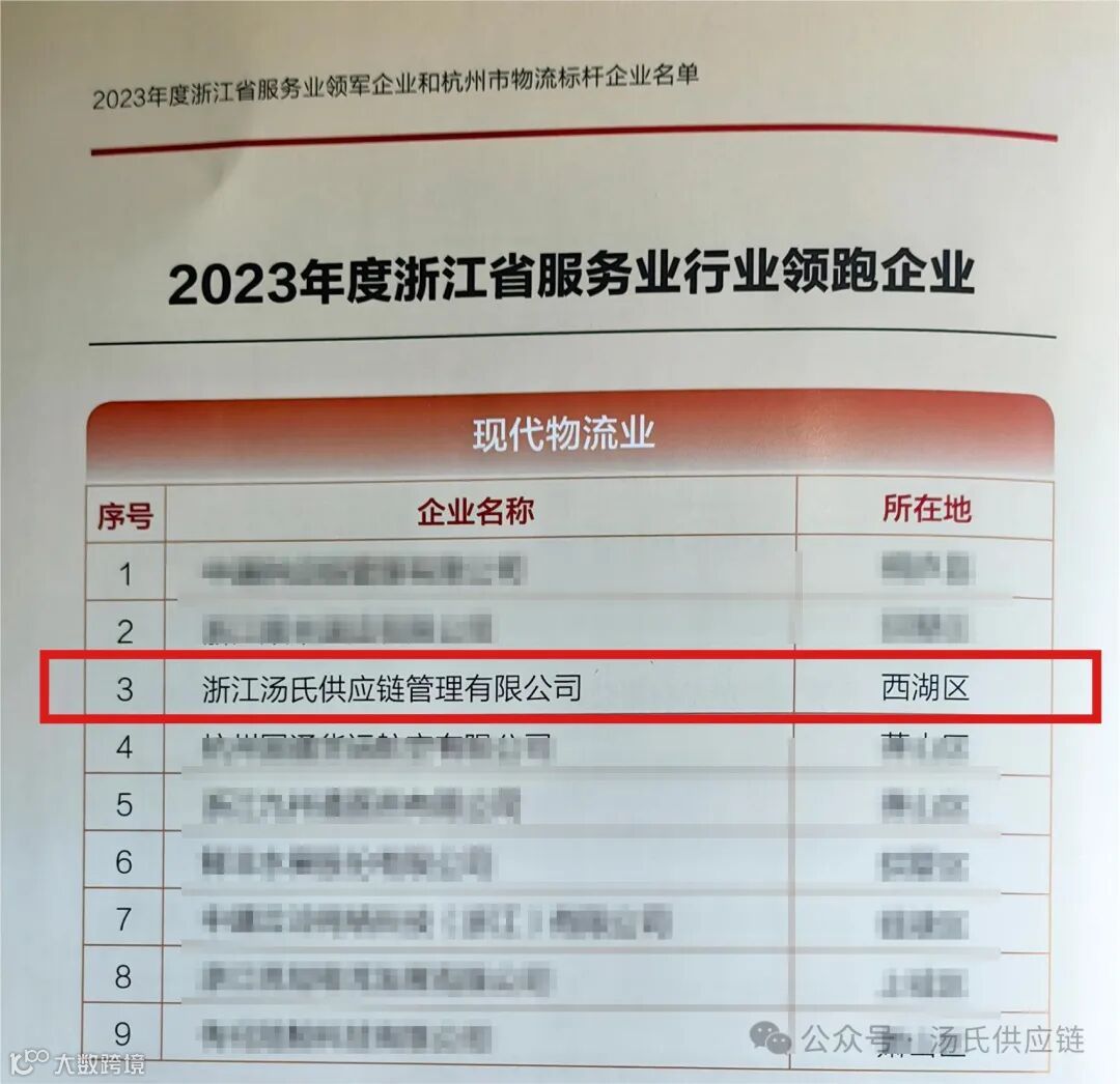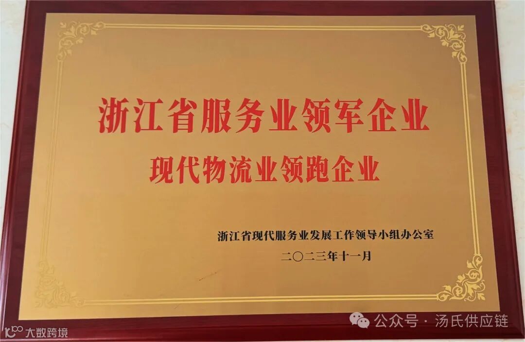 近日,浙江省召开生产性服务业高质量发展大会。会议介绍了我市生产性服务业发展情况,并通报了2023年浙江省首批服务业领军企业名单。其中,汤氏供应链荣获“浙江省服务业领军企业(现代物流业领跑企业)”称号。