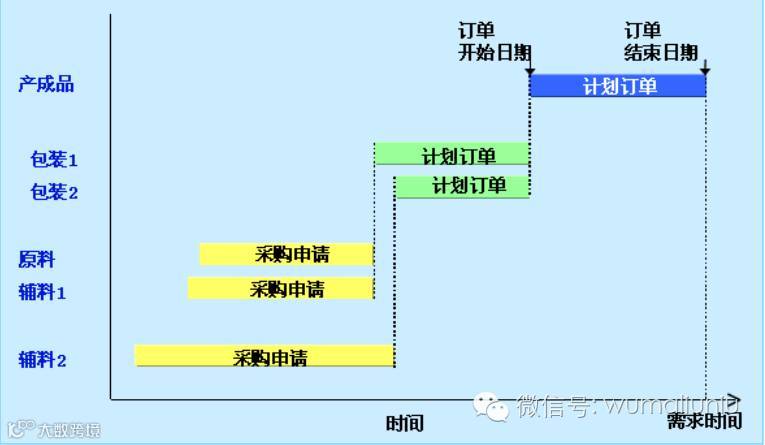 如上图所示,MRP运算时会对“提供方”和“需求方”的短缺量进行比较,然后根据生产或者采购批量来创建相应的计划订单。计划订单或者采购申请的结束日期为上阶物料对该物料的需求日期,开始日期为结束日期减去该物料自身的生产或者采购周期(如下图)。