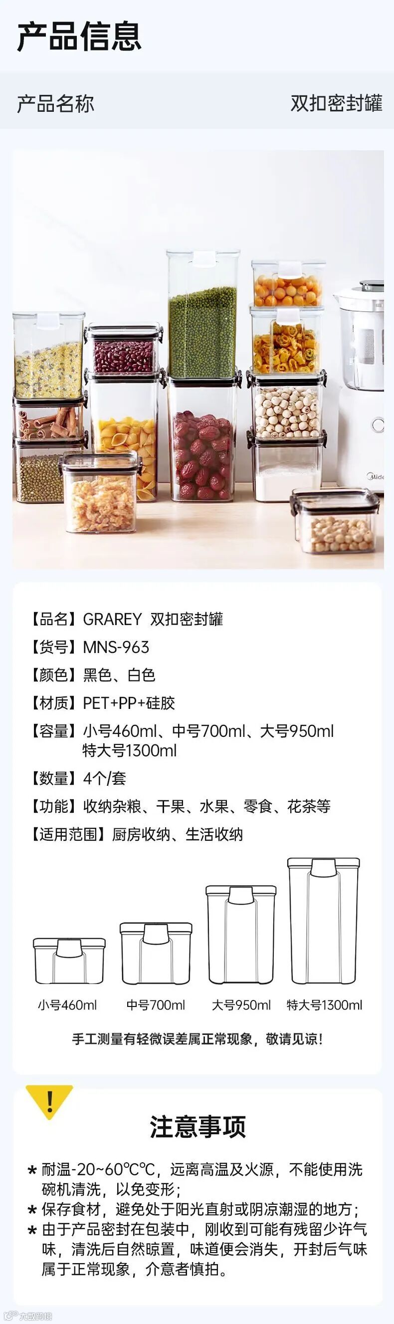 这样一组460ml+700ml+950ml+1500m的4件套密封罐组合,适用家中各种食材零食类的存储。