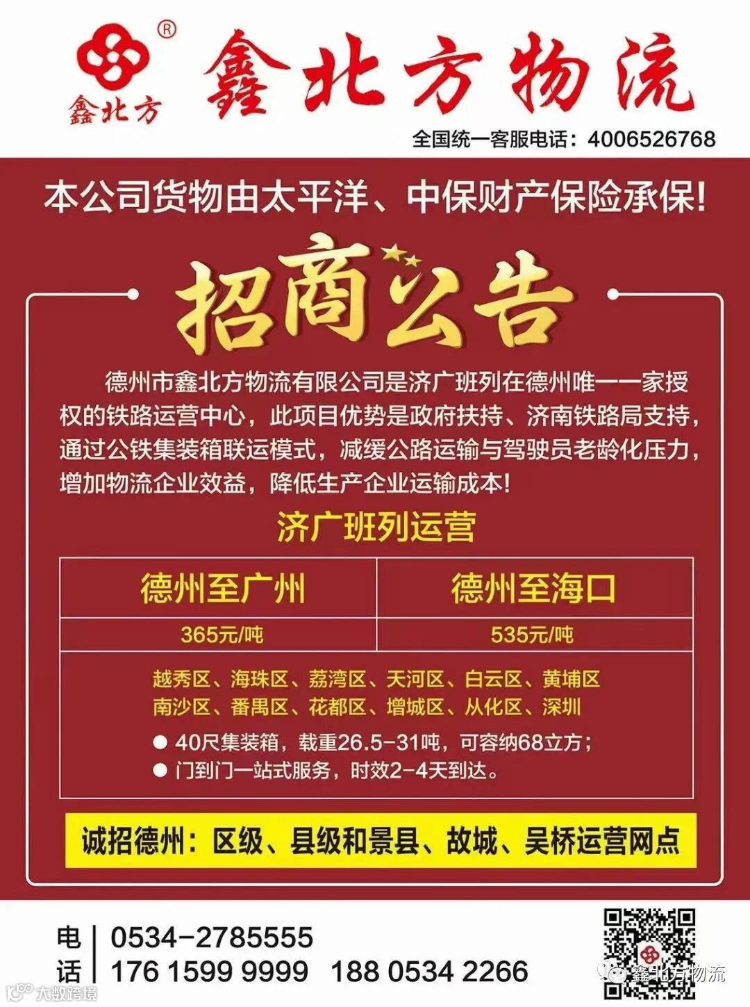 德州市鑫北方物流有限公司是济广班列在德州唯一一家授权的铁路运营中心,此项目优势是政府扶持、济南铁路局支持通过公铁集装箱联运模式,减缓公路运输与驾驶员老龄化压力,增加物流企业效益,降低生产企业运输成本!