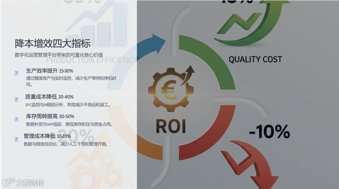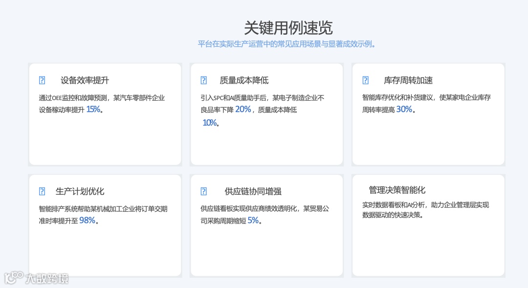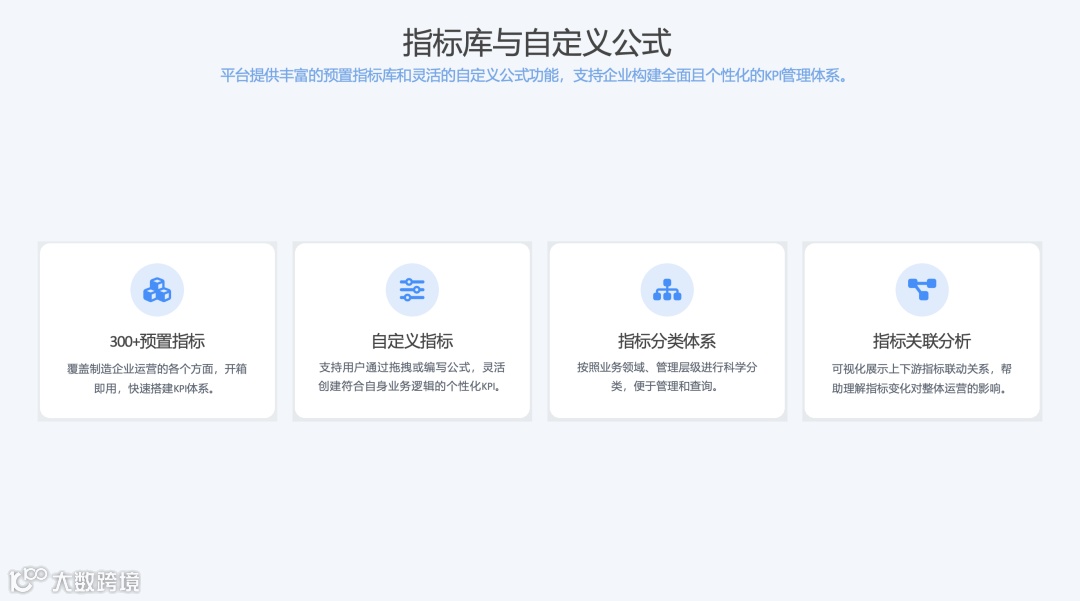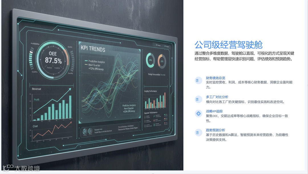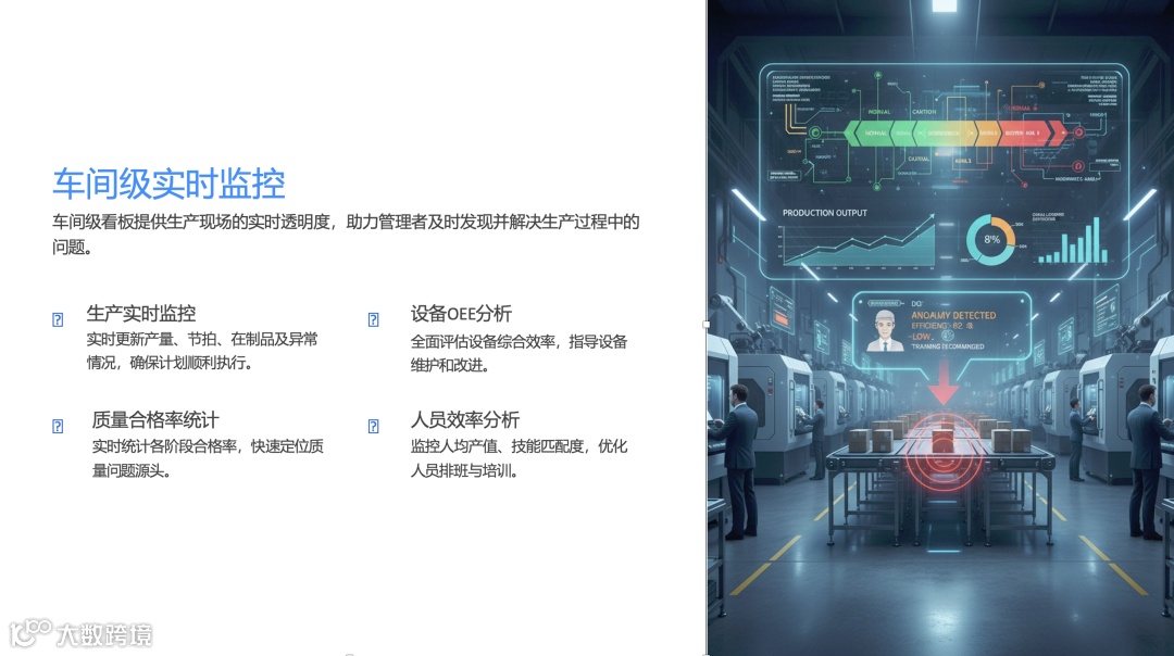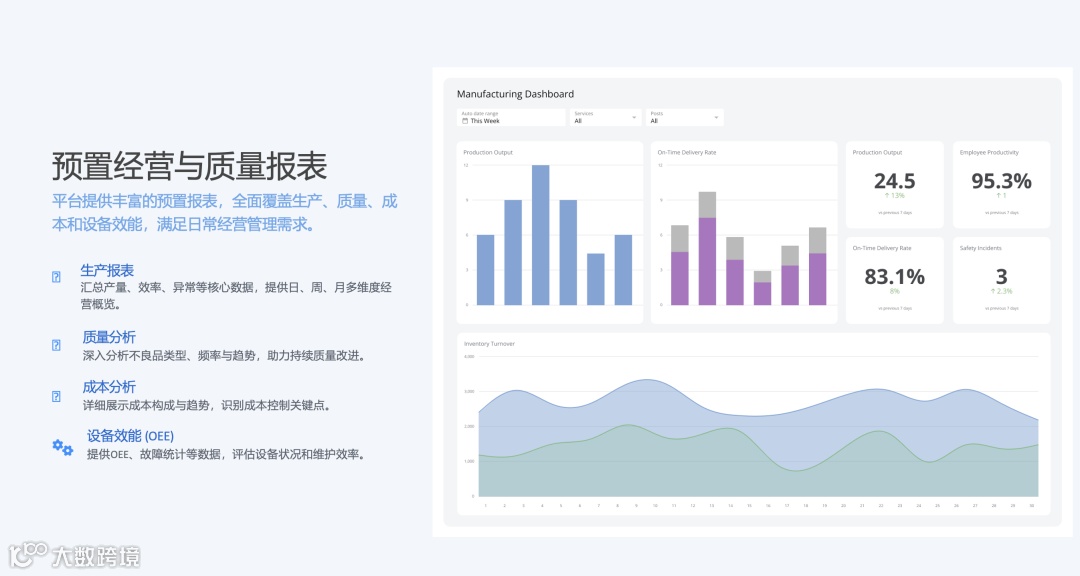提供多维度、预置化报表的管理平台,重点覆盖了生产制造过程中的效率、质量、成本和设备管理。通过一个可视化的制造业仪表板,系统能够直观地呈现关键业务数据和趋势,帮助管理层快速掌握企业运营状况,并支持进行科学决策和持续改进: