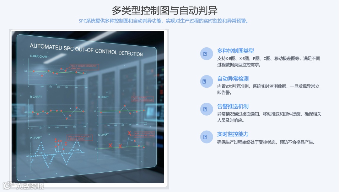 该平台包含的SPC 系统通过提供多种统计过程控制图表和自动化的异常检测及告警功能,来实现对生产过程的有效、实时的质量监控和管理: