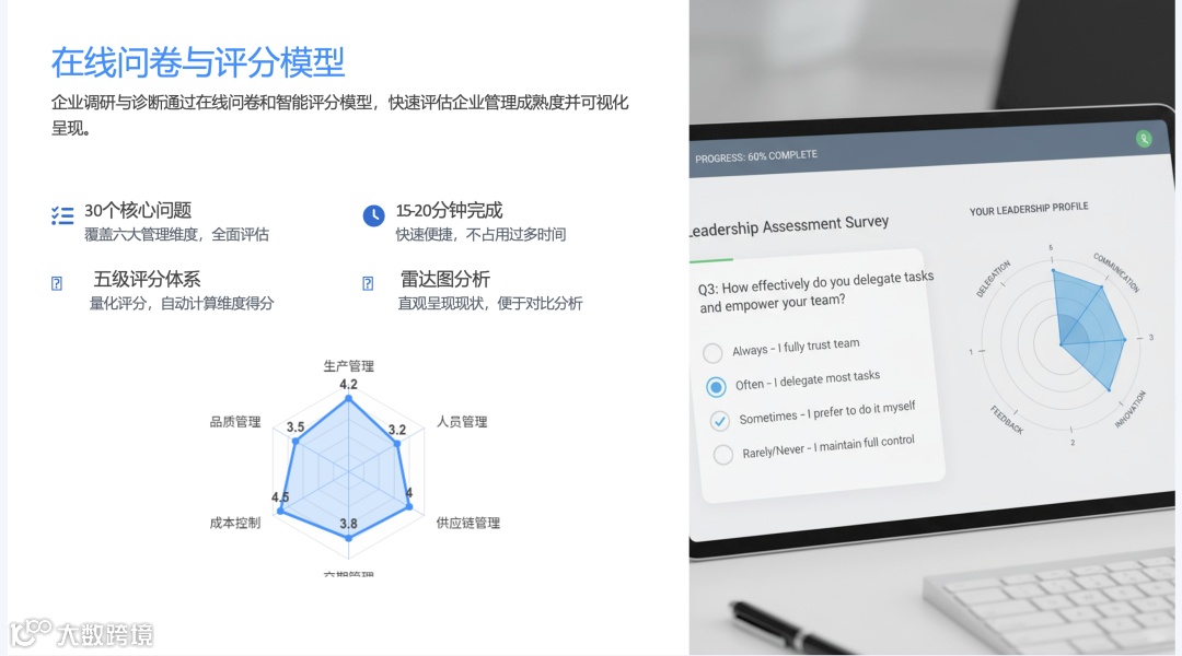 企业管理成熟度评估的在线诊断工具。它通过结构化的(30个核心问题)、便捷的在线问卷和五级评分体系,自动计算并以雷达图的形式直观地展示企业在生产、品质、成本、人员、供应链等多个关键管理维度的现状和成熟度,从而帮助企业快速定位问题和制定改进策略: