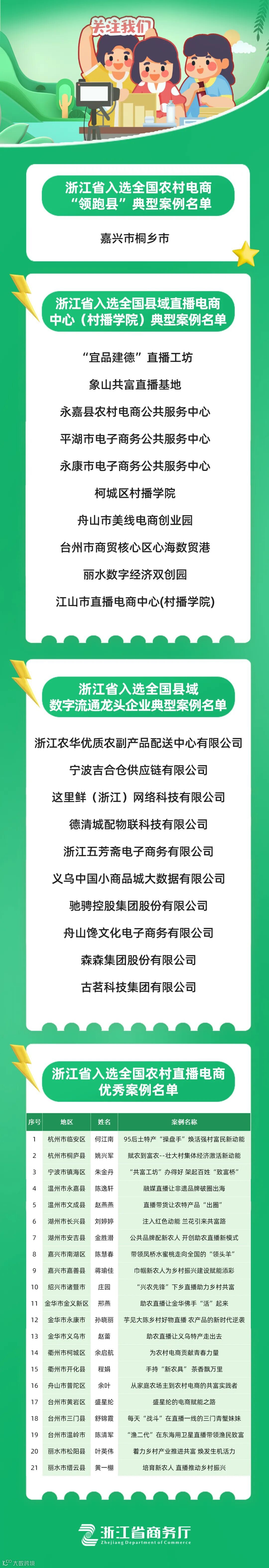 近期,商务部公布了2024年全国农村电商“领跑县”、县域数字流通龙头企业、县域直播电商中心(村播学院)典型案例和农村直播电商优秀案例名单,浙江省42家单位、企业、个人案例上榜。