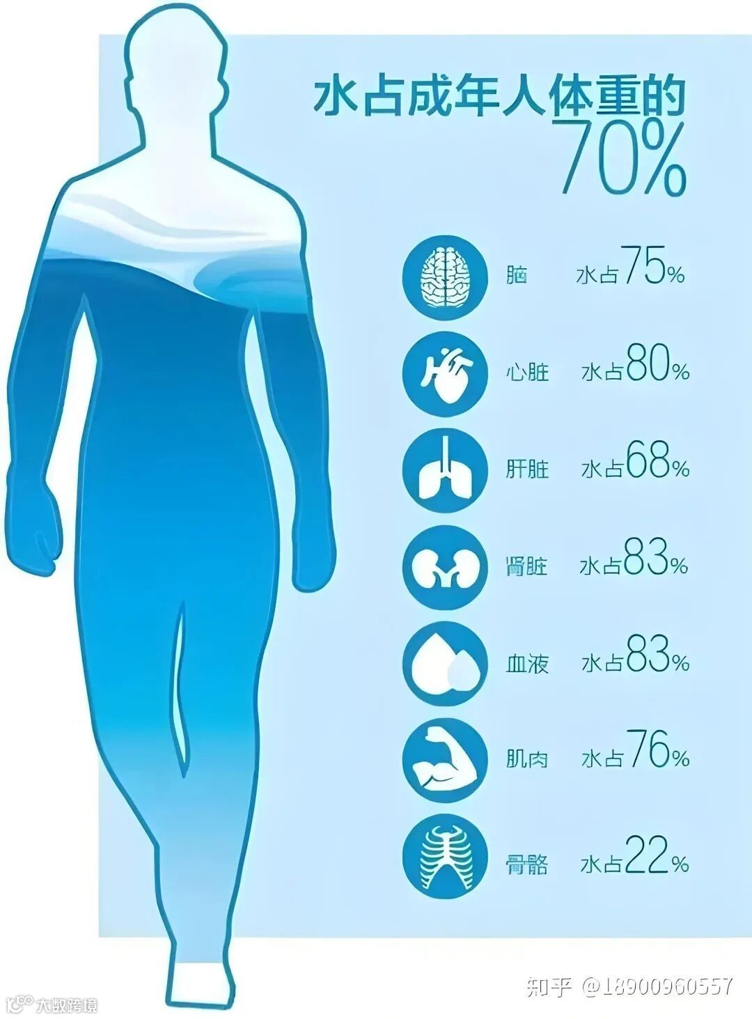 人体的60%-70%由水分组成,可以促进人体新陈代谢,在调节体温、维持身体电解质平衡等方面发挥着重要作用。
