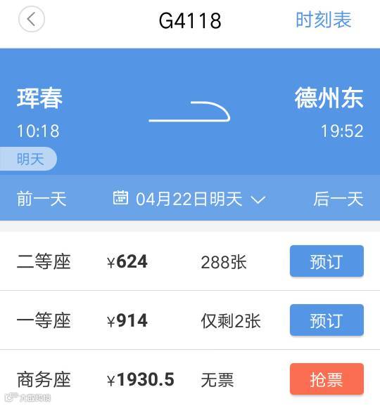 返程的G4118/5次高铁列车是上午10点18分从珲春出发,最终在晚上19点52分到达德州东站,全程9小时34分钟。车票二等座是624元/人,一等座是914元/人,商务座是1930.5/人。(价格以当天为准)