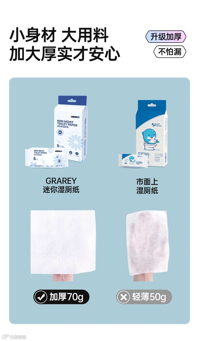 咱们GRAREY这款迷你湿厕纸,真正满足更轻巧、更便携的需求,随手揣口袋轻巧无负担!