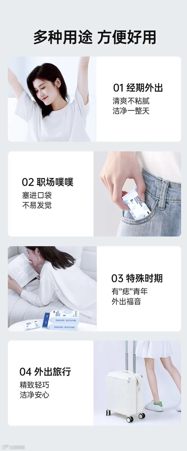 作为一款外出携带的湿厕纸来说,真的很推荐!!出门也能代替湿巾擦手擦脸,一物多用,出门带这一包就够了!