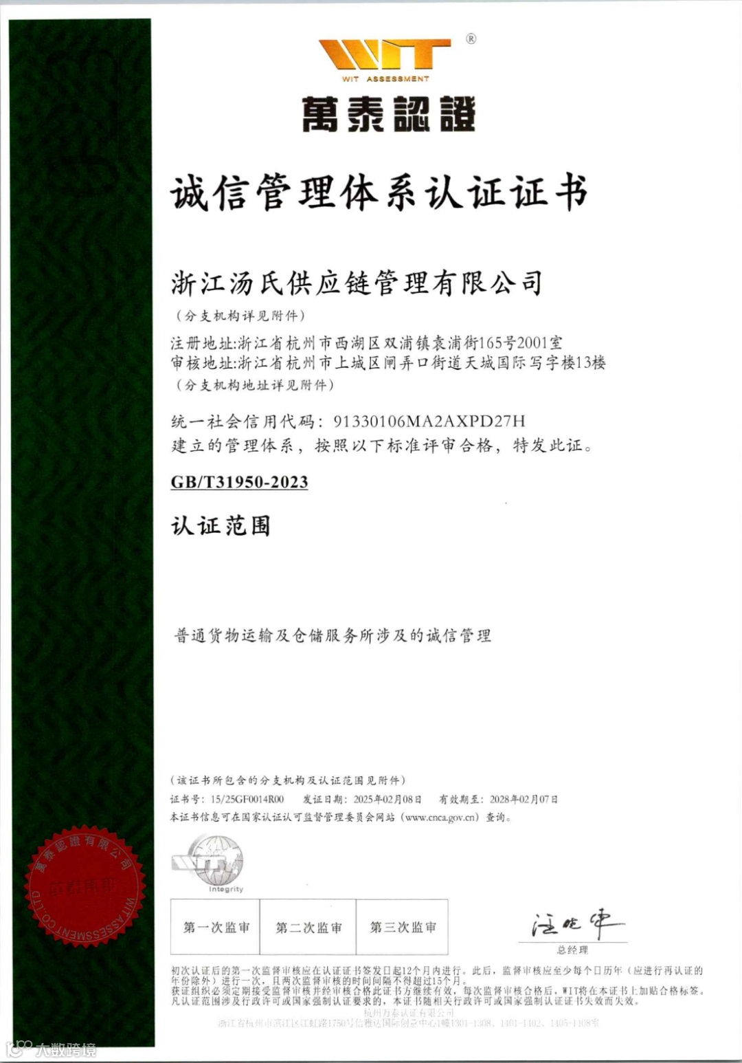 诚信,是企业立足之本,更是汤氏自成立以来始终秉持的核心价值观。从原材料采购到物流配送,从客户服务到售后支持,每一个环节我们都力求透明、高效、可靠。这份沉甸甸的证书,不仅是对我们过去努力的认可,更是对未来持续践行诚信经营理念的鞭策。