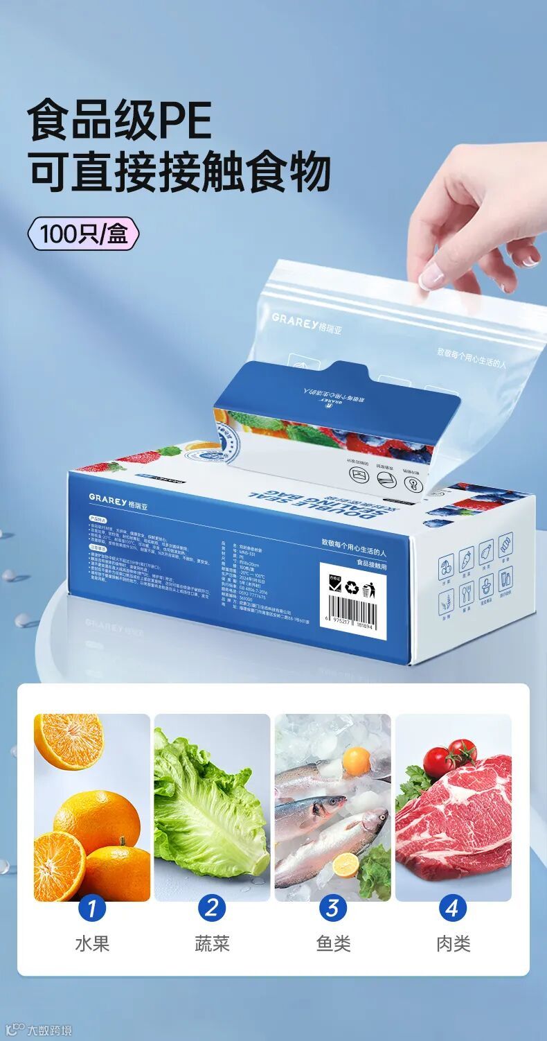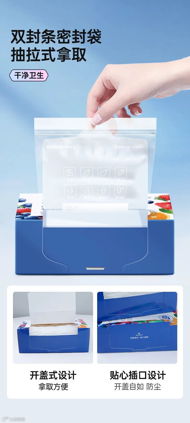 保鲜袋简单抽取式更方便,扁平的盒装设计,放在哪里都可以