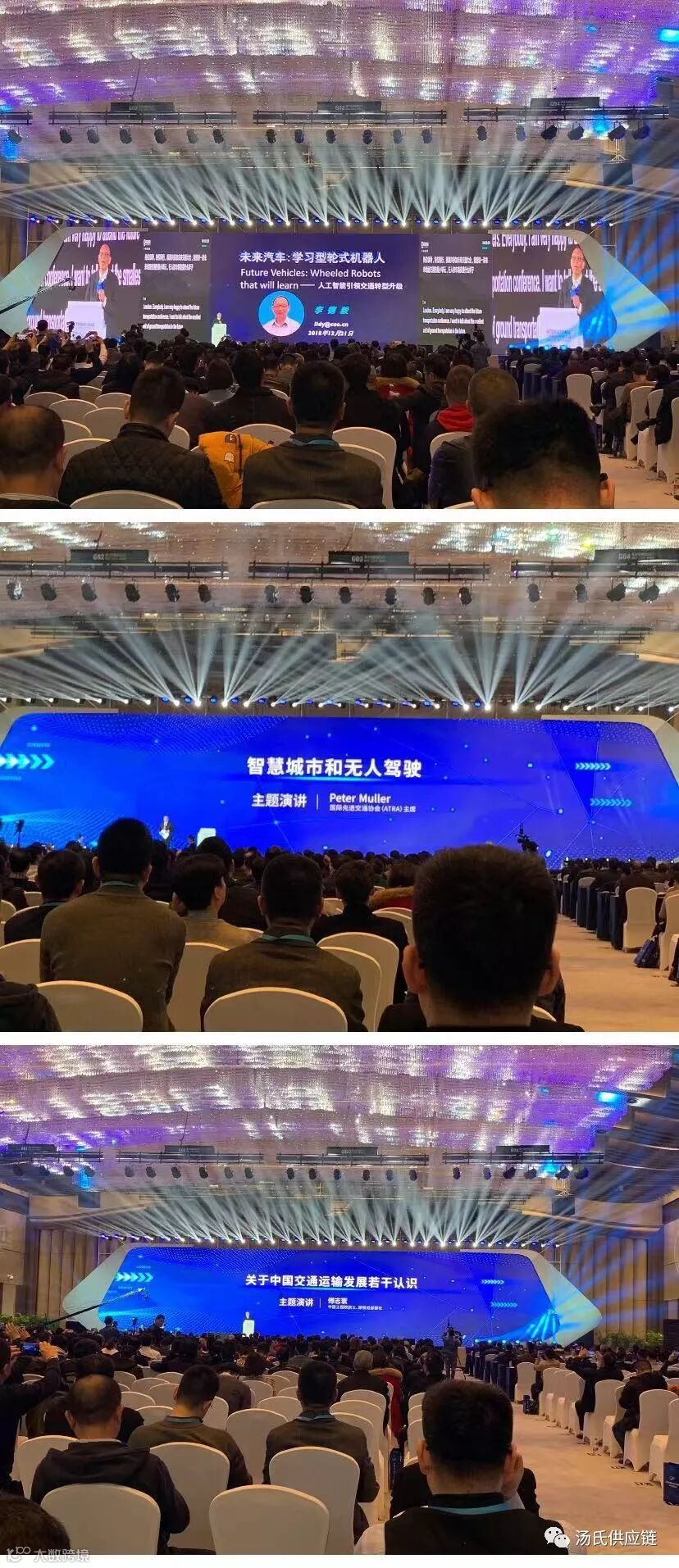 而后,中国工程院院士、国际欧亚科学院院士李德毅先生分享了“未来汽车:学习型轮式机器人”的主题演讲,表达了他在人工智能领域不一样的声音和看法;国际先进交通协会(ATRA)主席Peter Muller先生,就关于“智慧城市和无人驾驶”课题做了图文讲解;中国工程院院士、原铁道部部长傅志寰先生压轴登场,在“关于中国交通运输发展若干认识”演讲中,表达了他对于中国交通发展成就与机遇、战略目标、战略重点、关键突破点和战略保障等方面的独特观点。