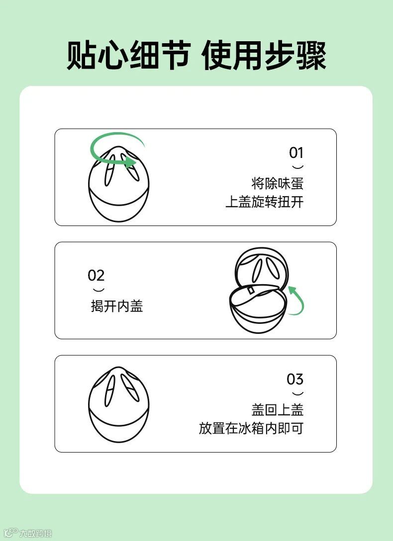 将最天然的异味分解元素,聚集在一个鸡蛋大小的蛋杯中!轻盈小巧造型,不占地,可以放在冰箱任何一个角落