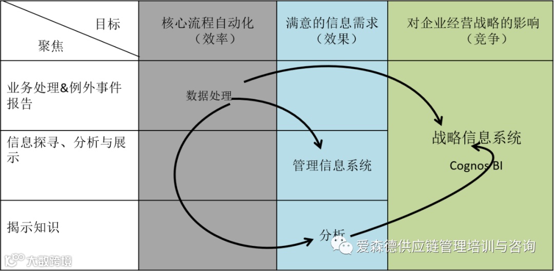 纵向组件是一个可更改的目标、流程、程序或资源(设备、系统、数据等),为一条业务单元服务。从上图我们可以看出,企业的数据处理、数据分析、管理信息系统与商业智能存在相互依存的关系: