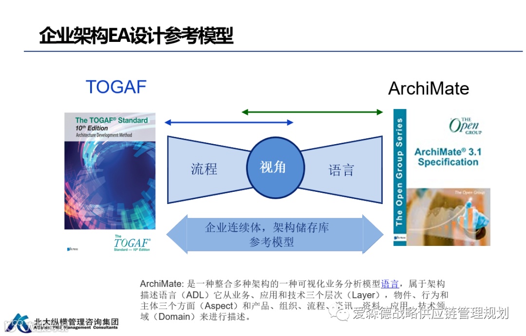 五、建模语言:Archimate是一种整合多种架构的一种可视化业务分析模型语言,属于架构描述语言(ADL)它从业务、应用和技术三个层次(Layer),物件、行为和主体三个方面(Aspect)和产品、组织、流程、资讯、资料、应用、技术领域(Domain)来进行描述。