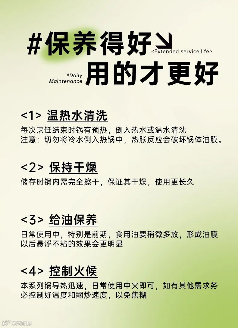 几乎不需要过多的注意,只需用清水冲洗,配合少量的洗洁精,轻松洗净油渍,就能恢复锅具的光洁度。