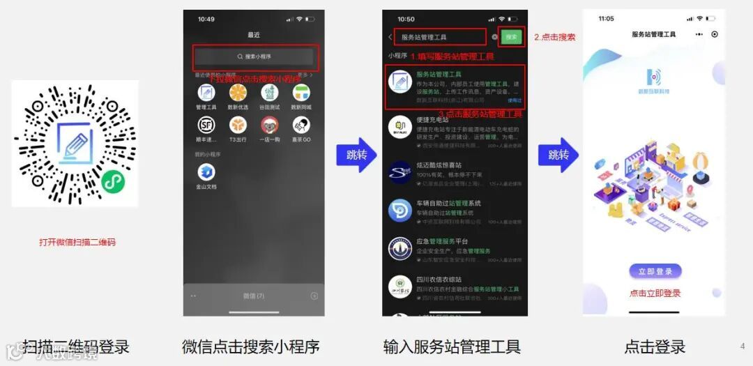 首先介绍的是系统操作方面的内容,我们的系统叫做“服务站管理工具”。我们可以通过以下两种办法进入,一是扫描小程序二维码,直接跳转至服务站管理工具。二是在小程序中搜索“服务站管理工具”。进入后需要注册,账号是共富合伙人们的手机号,密码是手机号后六位。