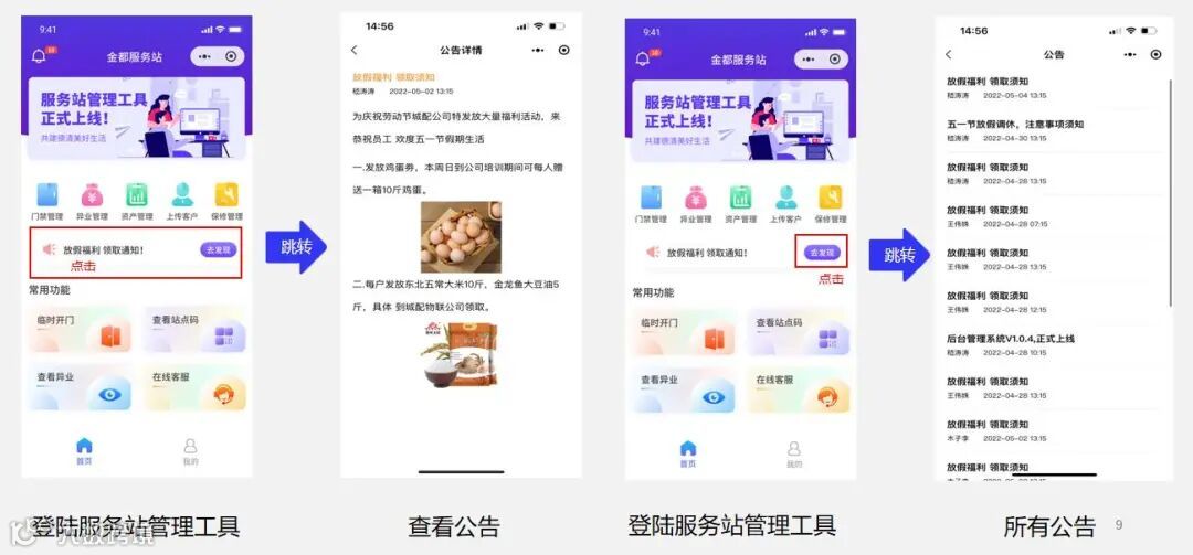 第三部分是通知公告,我们在日常工作的时候,可以通过后台管理系统进行公告发送。共富合伙人会在首页看到公告,我们除了发布一些通知,也会发布一些小活动、服务小技巧。大家可以多多关注一下。
