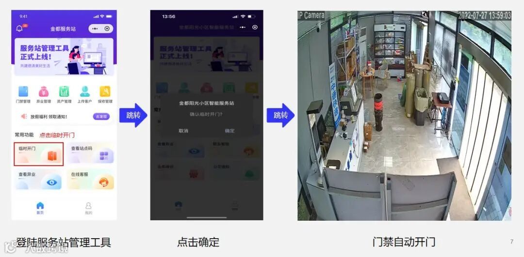 接着为大家介绍了我们研发的一键开门功能。我们系统的首页常用功能中有一个“临时开门”,点击临时开门,点击确定,就可以实现远程开门。