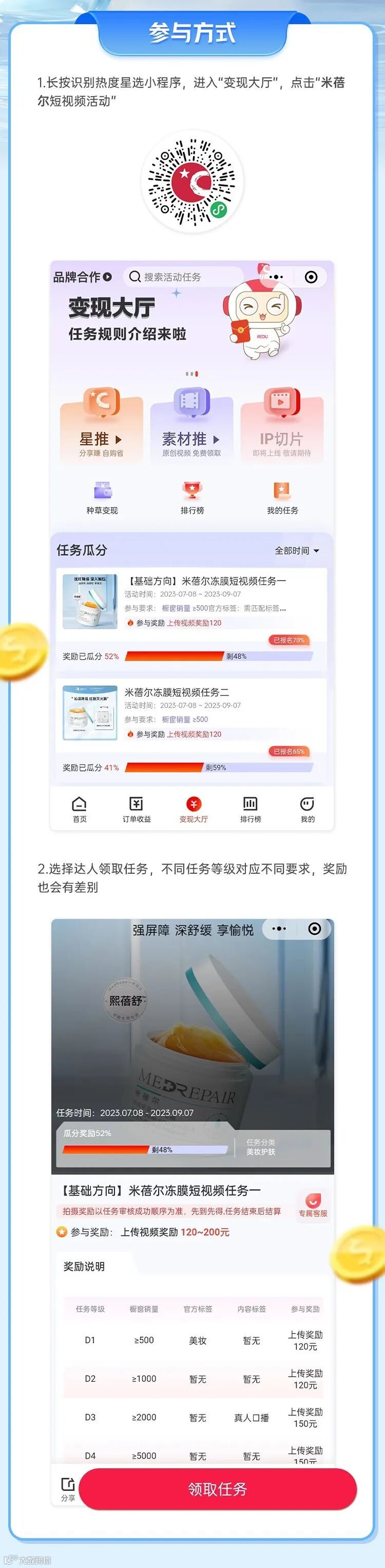 🎁 奖励方式:品牌(米蓓尔)任务参与,上传符合活动要求的视频(需挂商品链接),即可获得120元/150元/200现金奖励。