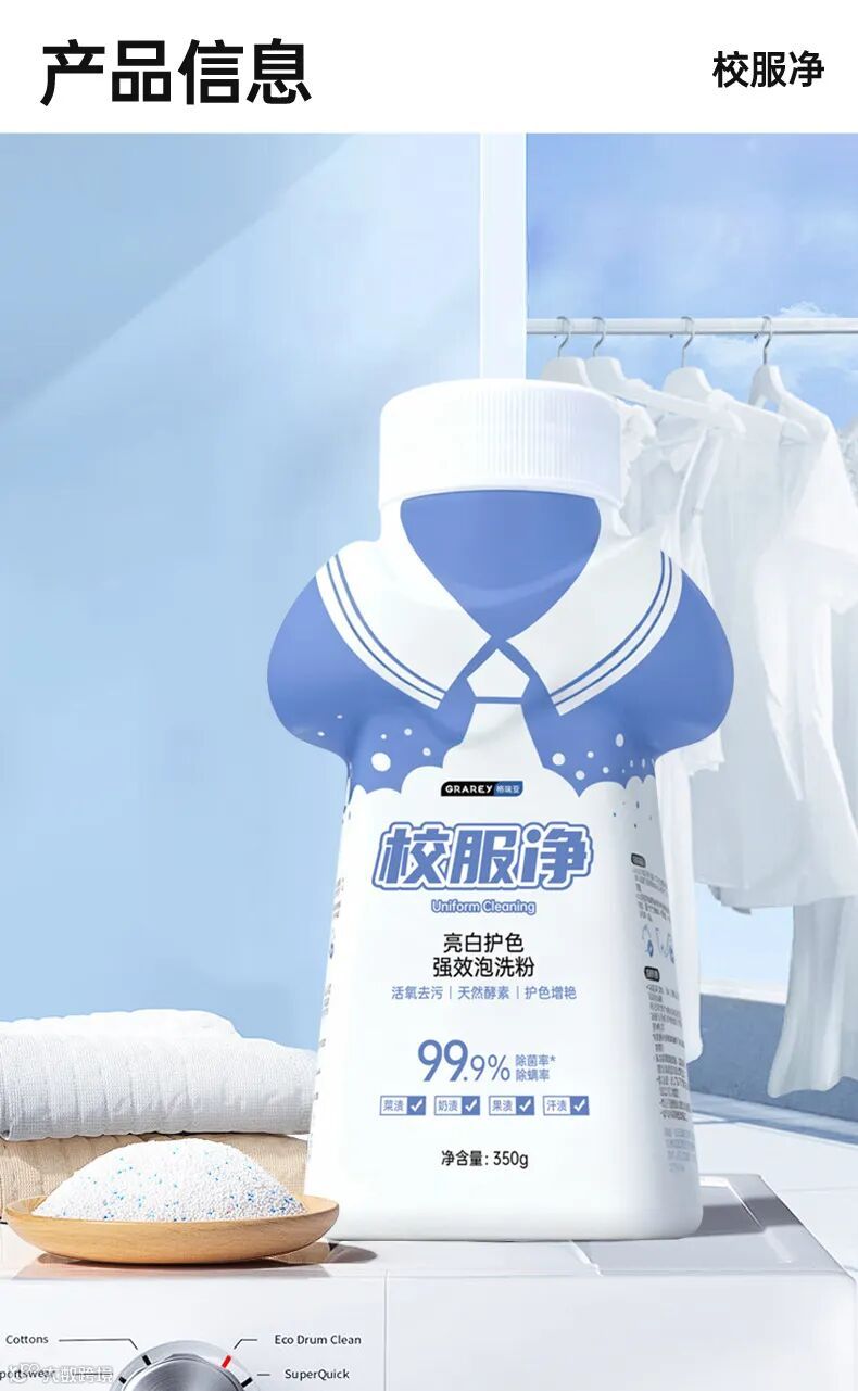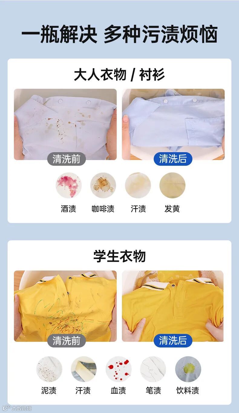 可清洁多种污渍❗️果渍、奶渍、汗渍、发黄、菜渍等,轻松泡一泡,瞬间亮白新~