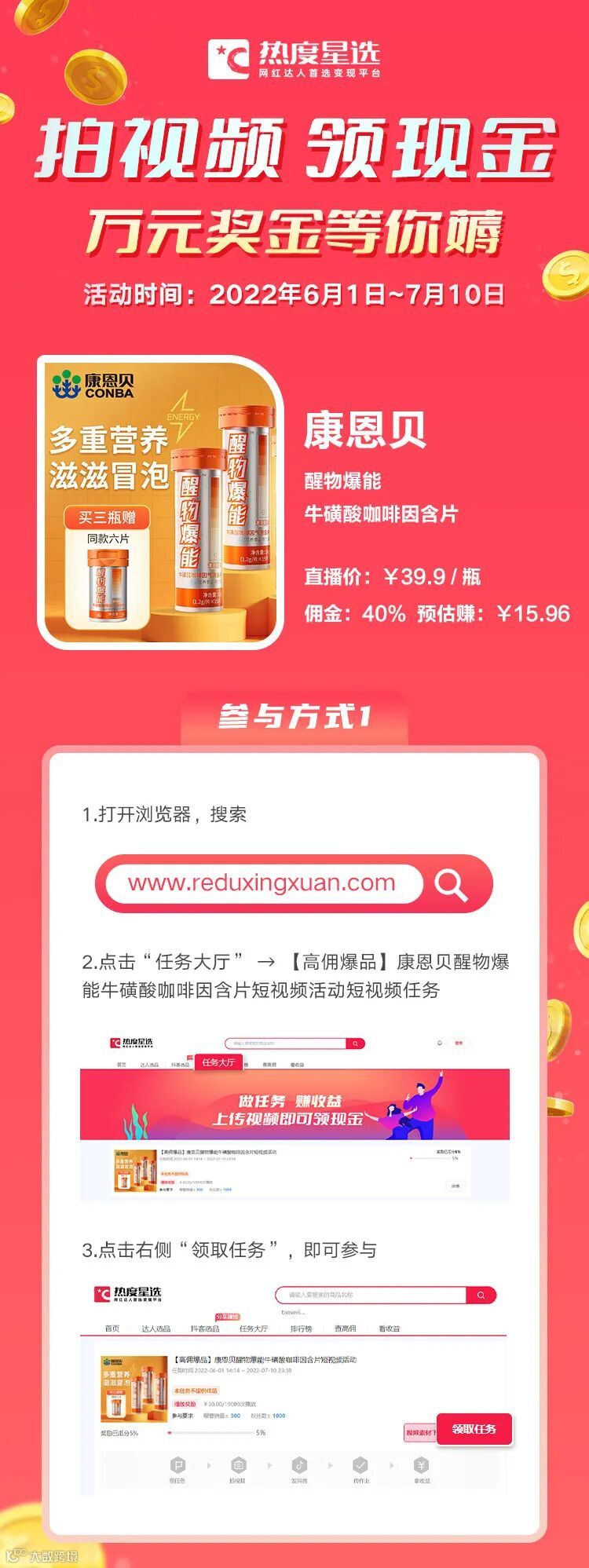重点说明:视频在抖音发布时务必检查是否将关联商品【康恩贝醒物爆能牛磺酸咖啡因含片学生党白领15片/瓶】添加至小黄车,不得发布与商品主题无关的内容,视频发布30天内不得删除。