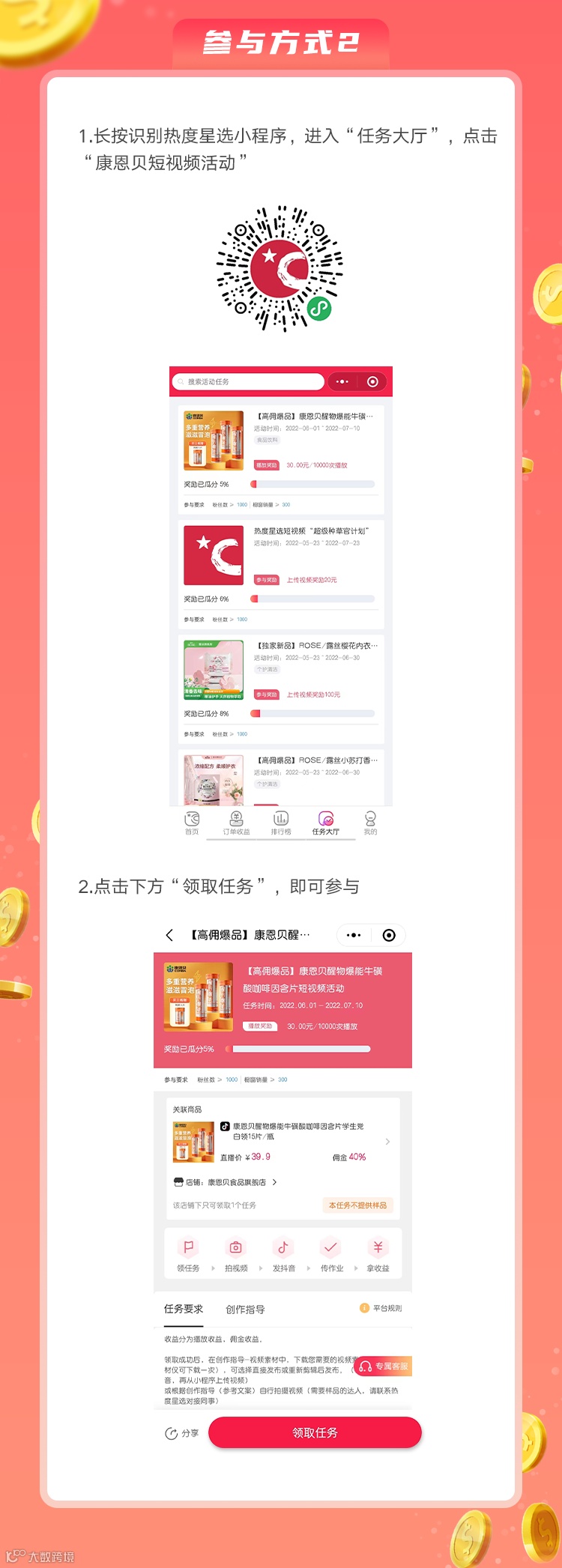 领取成功后,在“创作指导”-“素材视频”中,下载您需要的视频素材(每个素材仅可下载一次),可选择直接发布或重新剪辑后发布。(请先发布抖音,再从小程序上传视频);或根据“创作指导”(文案脚本)自行拍摄视频(需要样品的达人,请联系热度星选的工作人员);