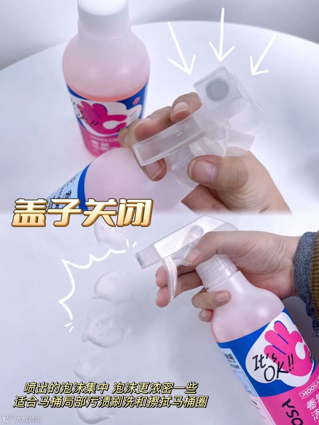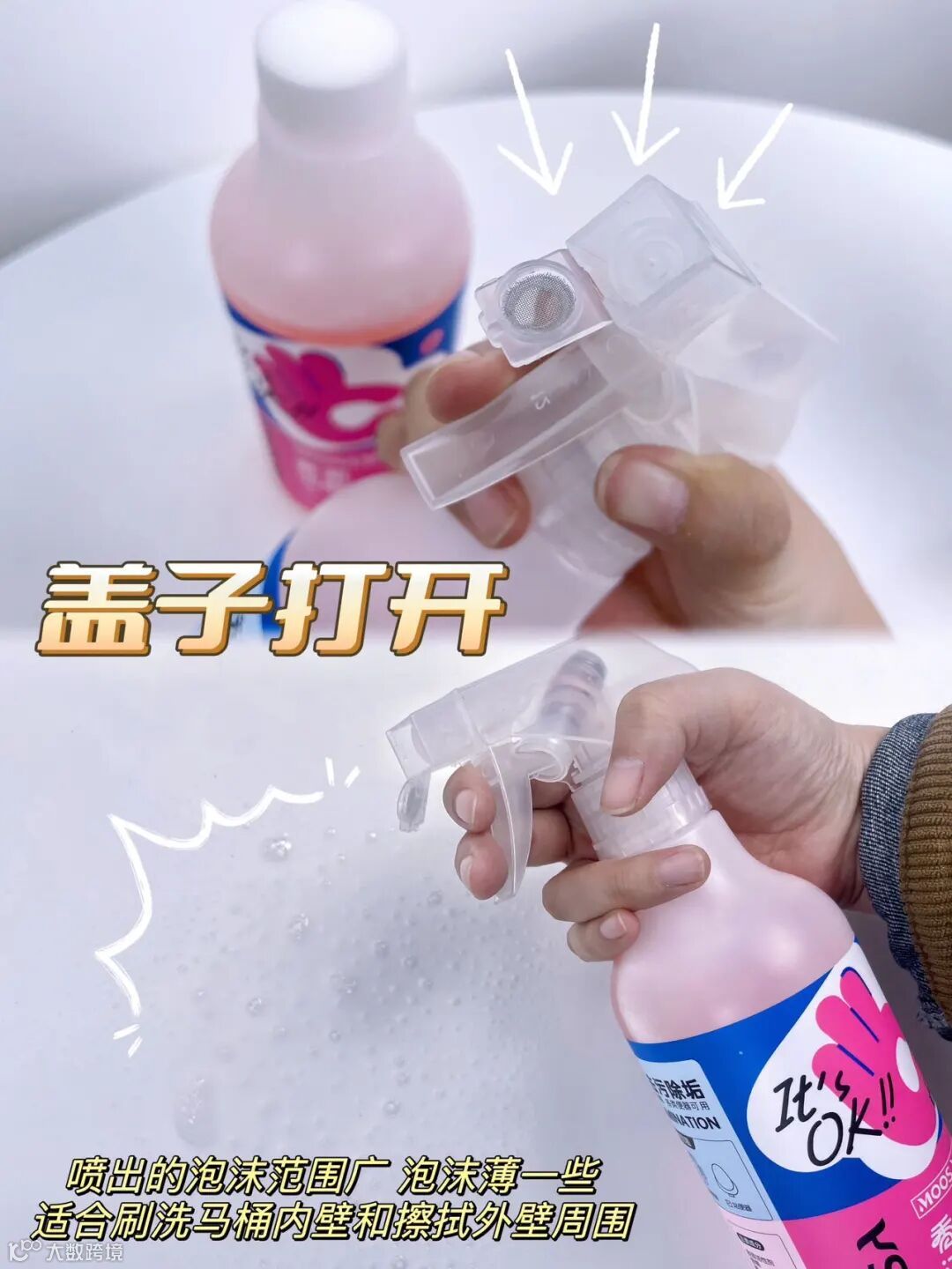 盖子打开,喷出的泡沫范围广,泡沫薄一些,适合刷洗马桶壁和擦拭外壁周围