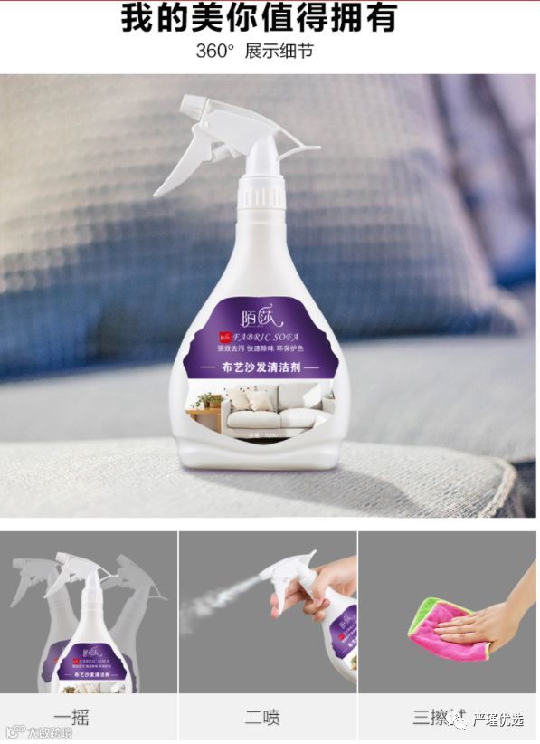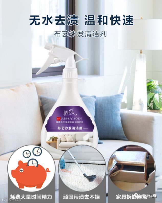 布艺沙发清洁剂:沙发 窗帘 羽绒服 棉衣 被子 裤子等遇到红酒-菜品油渍-咖啡-酱汁-血渍-果汁等都能够清除干净 免水洗!