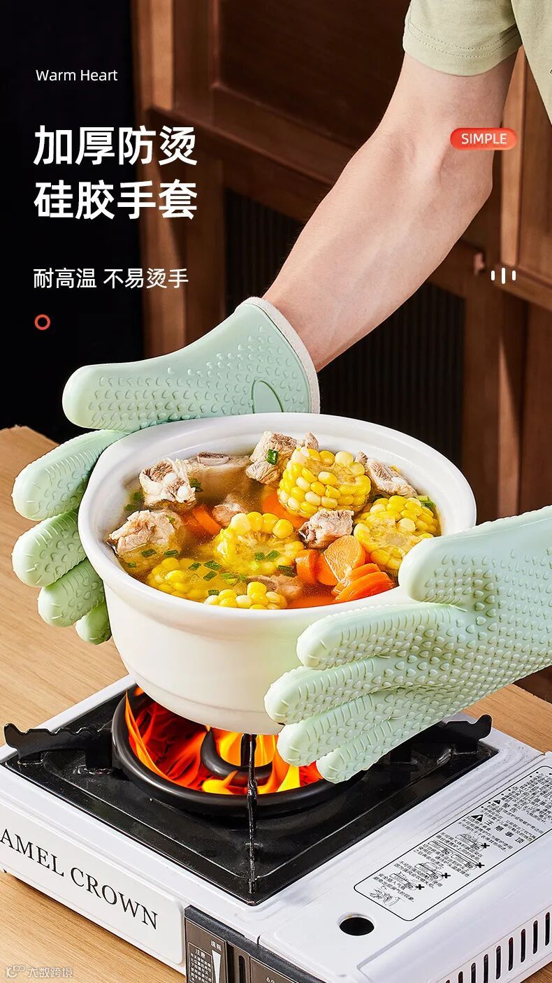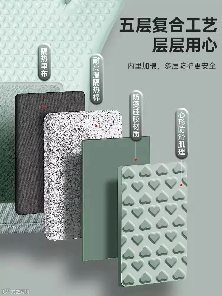 这款防烫性能绝对是同类的佼佼者了,手套有五层隔热设计,防烫硅胶层+隔热棉+隔热里布+防滑层,多层防护更安全!