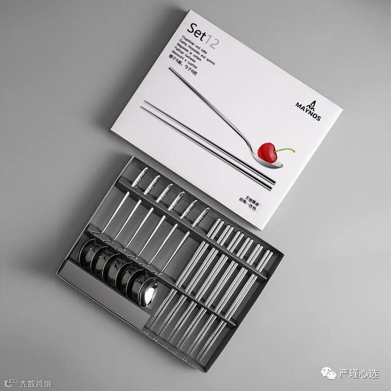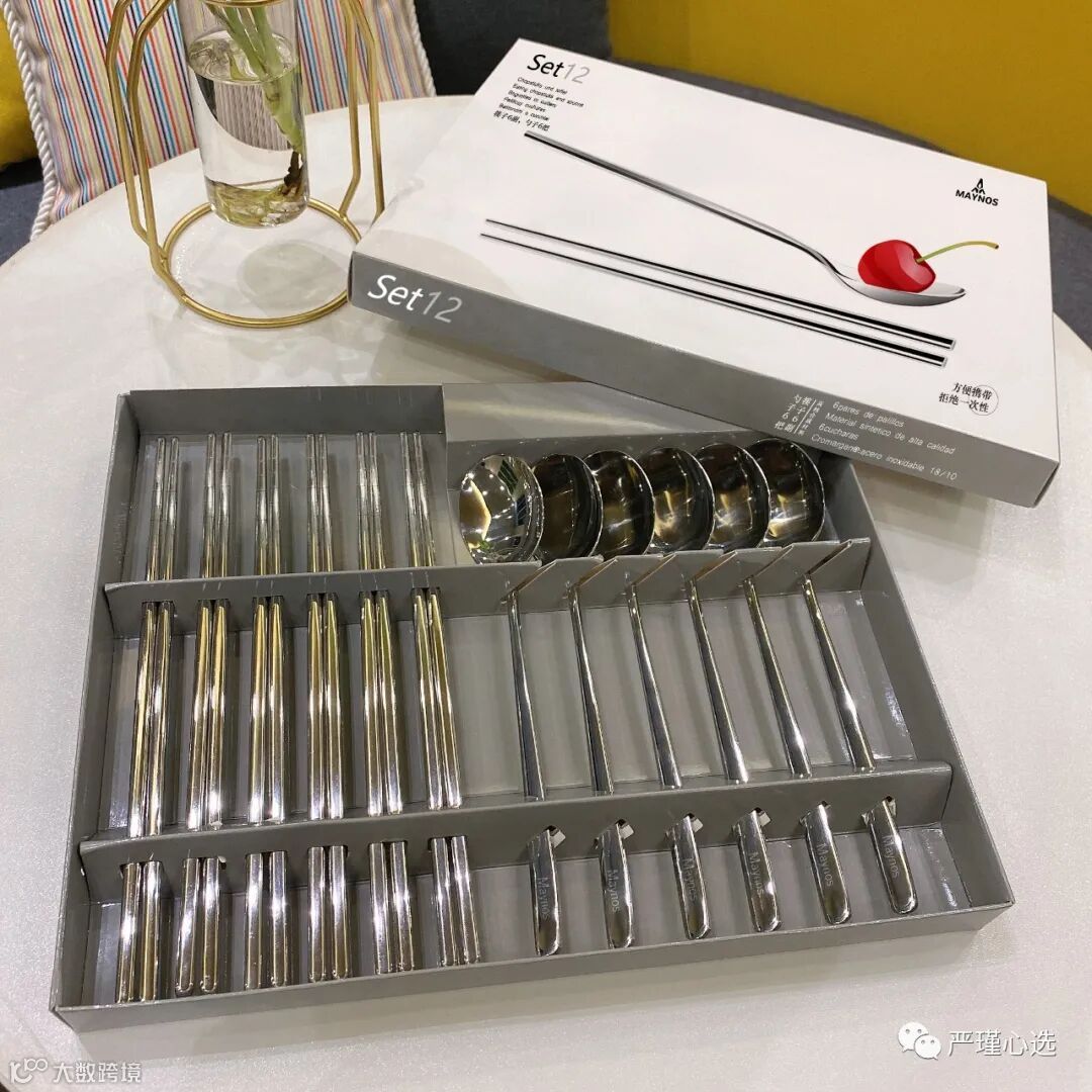 MAYNOS筷勺12件套装:304不锈钢餐具套装(6双筷子,6根汤勺),材质选用食品级304不锈钢,更耐用更抗蚀,完全没有金属离子析出,由于其耐用而且材质更安全 好的不锈钢,好的工艺,给人的第一感觉肯定是光滑精致,手感光滑,镜面银白色,光泽亮丽,带着几分大气和奢华。