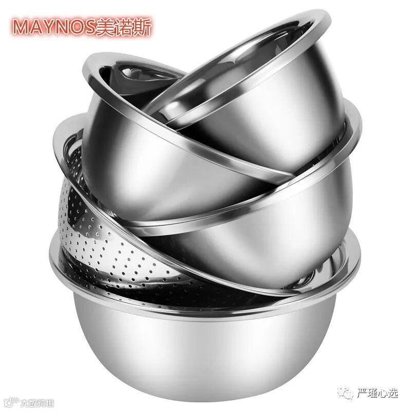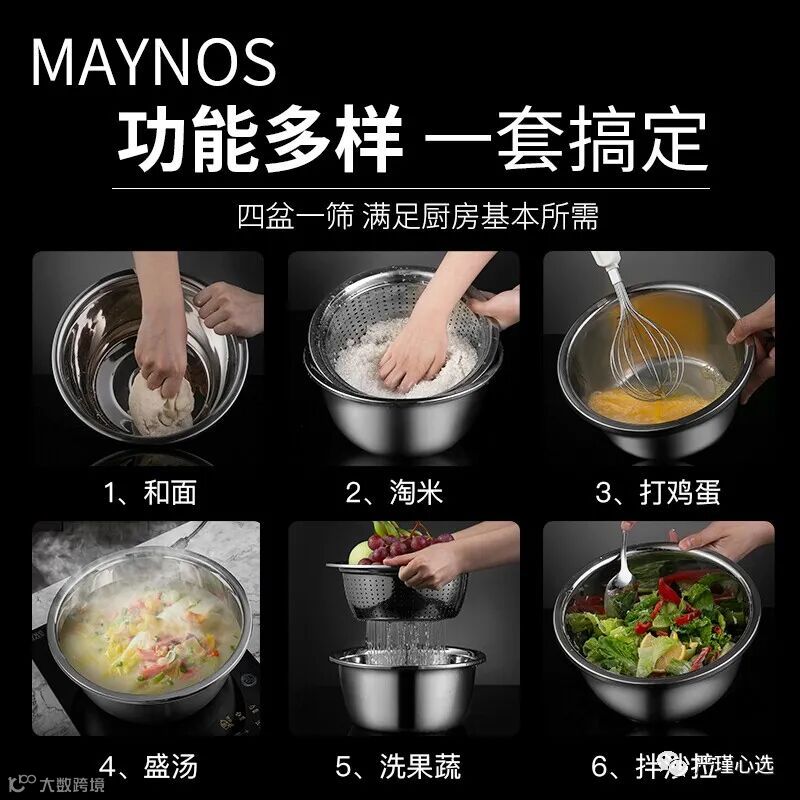 MAYNOS厨房5件套盆,加厚盆底,可用于电磁炉直接加热,当锅用,热汤很方便,且不挑炉灶!厚!是一种态度!加厚材质,厚实不易变形,抗摔,200斤的胖子站上去都没有问题。功能多样,四盆一筛,一套全搞定,满足厨房多需求,盛菜、拌面、做沙拉、放水果,洗米、和面、打鸡蛋等。