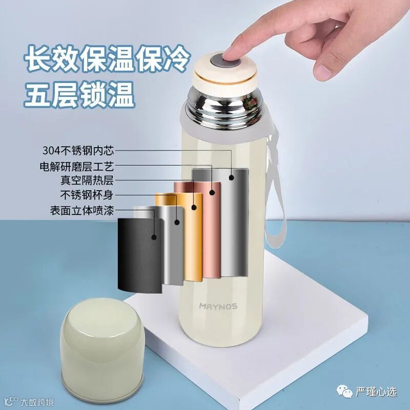 美诺斯(MAYNOS)304真空保温杯 大容量饮水杯,杯壶内采用304医用不锈钢。按压内塞,一按一压,减少水温流失。便携提绳,随时携带都很方便。杯盖可盛水,倒出小杯饮水。内胆表面采用电解研磨处理技术,不生锈,不氧化,防止污垢产生,极易清洗。密封圈采用食品级硅胶材料,杯盖,杯塞密封性极好,无滴漏! 带精美彩盒,内附合格证,说明书!