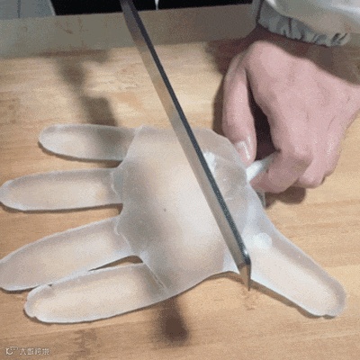 你看,直接用刀切,都没有破掉,真的比我以前用过的一次性手套好太多了!