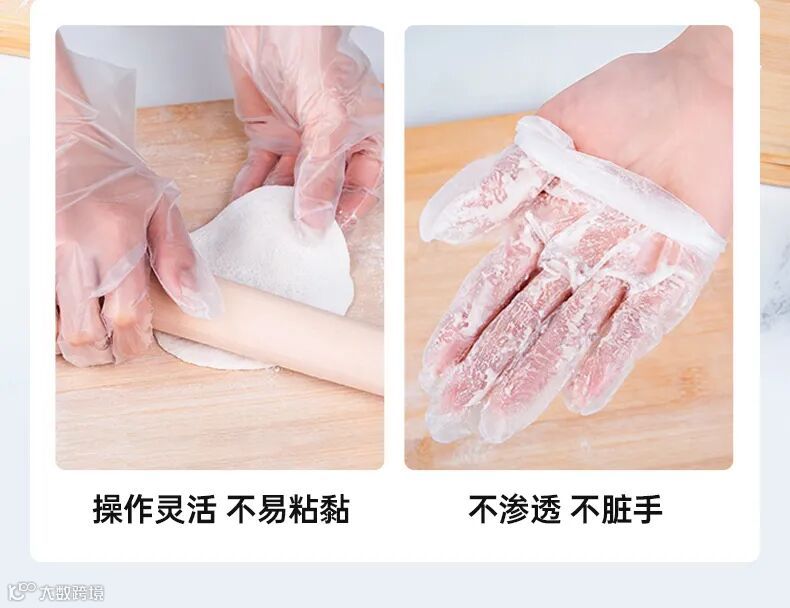 TPE食品级的材质,可以直接接触食物,使用也更加健康放心!洗菜、洗水果的时候戴着它,不会把手沾湿,防水不透。