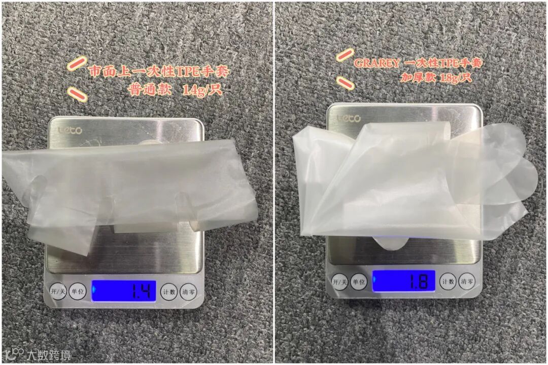 即使是对比相同的TPE材质手套,GRAREY手套做工细致,平整不皱又不粘,同类型材质手套整整厚了0.4g,结实更耐用!