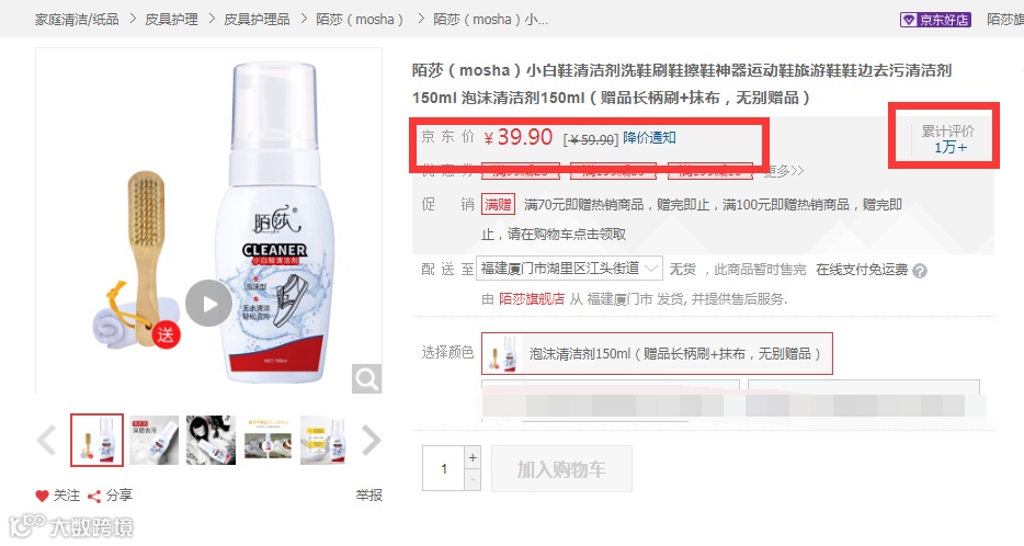 小白鞋干洗剂京东旗舰店1瓶零售价39.9元,销量1万+,好产品,好质量,消费者才愿意买单~