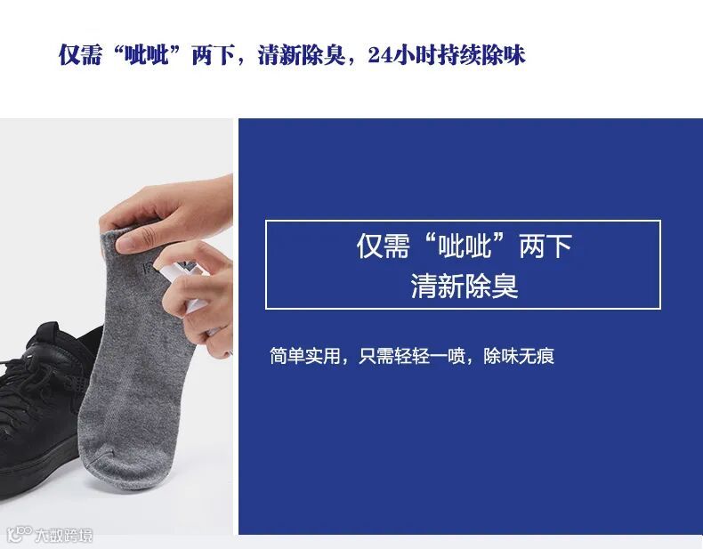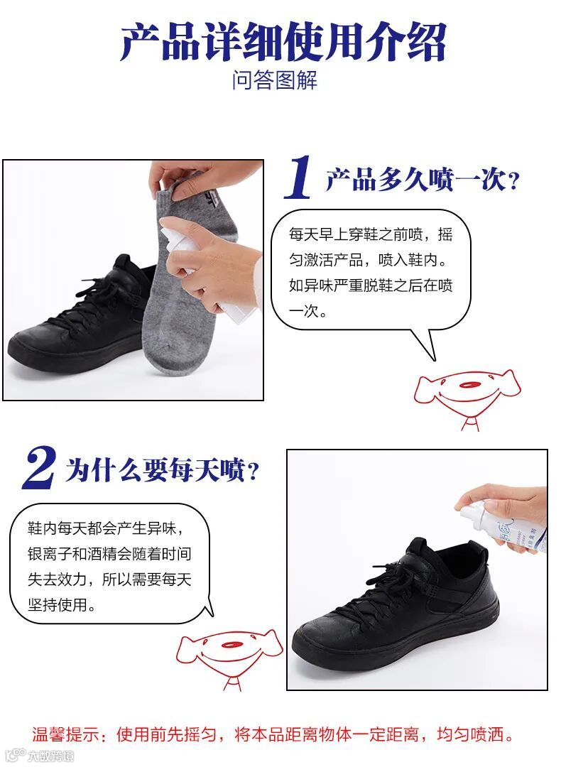 鞋袜除臭剂使用也非常简单,喷之前摇一摇,对准鞋内,或袜子,轻轻喷2-3下即可消除异味,脚臭~